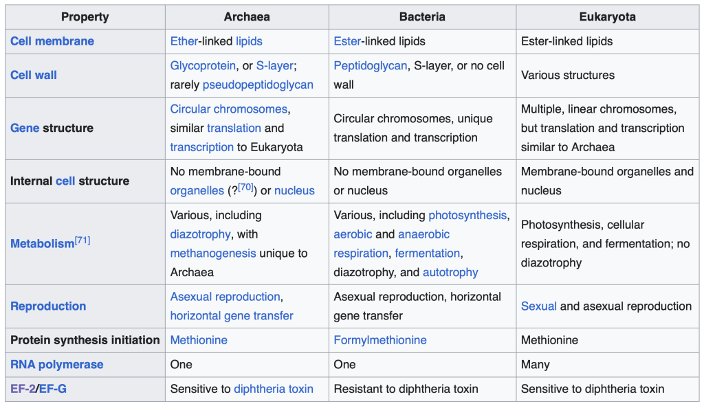 Around the same time as I was struggling with the course in Systematics, DNA research was showing that Archaea were different from both Bacteria, and the Eurkaryotes (single cell organisms with a nucleus). This table, taken from the Archaea page in Wikipedia, hints at the complexity: