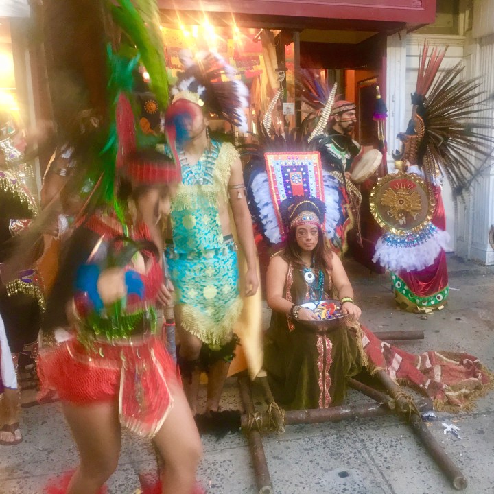 Halloween is a big deal around here. I guess it’s hard to organize treats in the walk ups and condos in Hoboken, so the businesses along Washington St fill the gap. The are many part time employees morosely sitting in doorways with a box of treats, but some places show off, like Charrito’s vegan restaurant with their Aztec extravaganza.