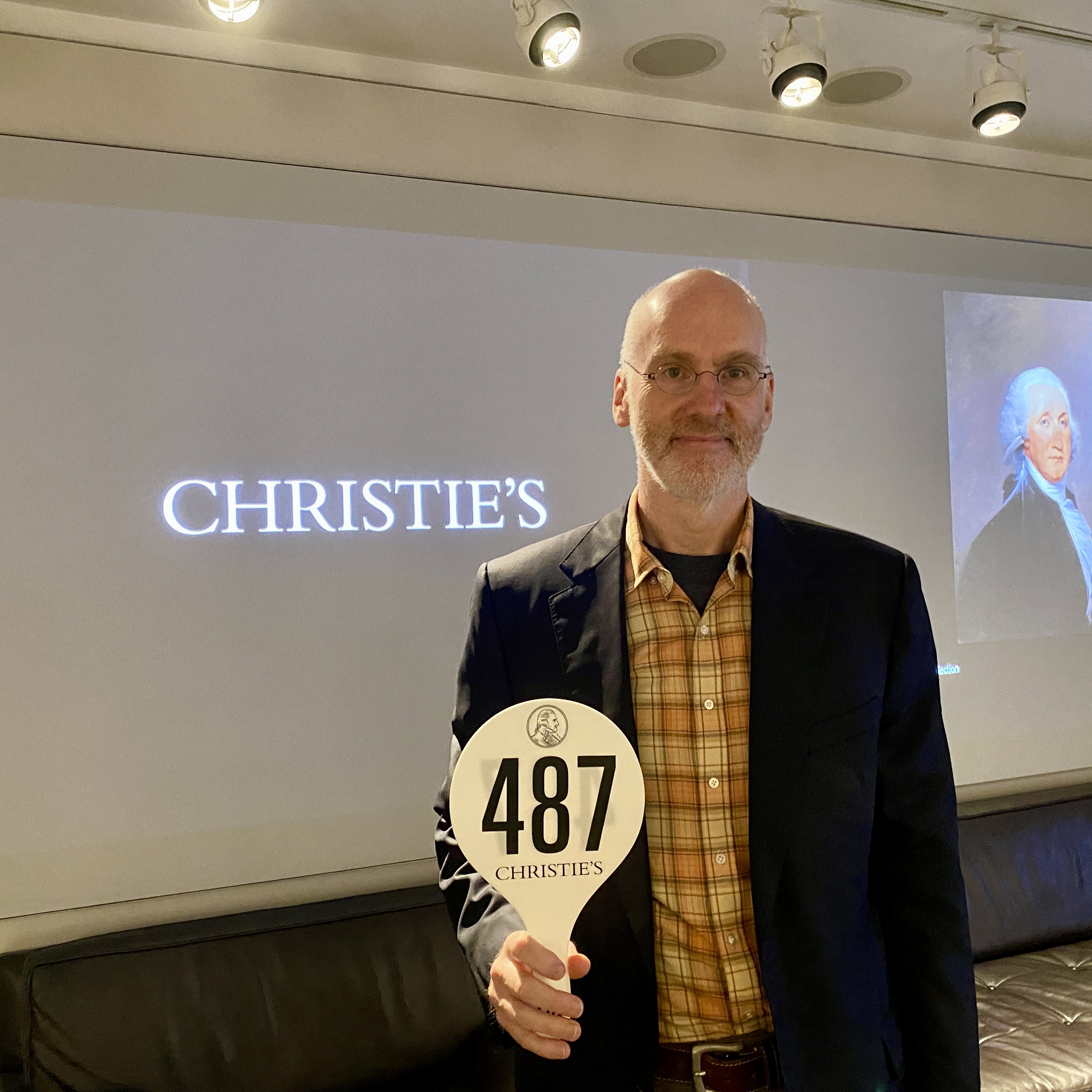 Most of the activity was on the phones or online, but occassionaly someone in the room would, almost imperceptably, place a bid. A raised finger or nod of the head, at the right time, seemed to be all that was necessary. The phone employees were more transparent, always raising a hand and calling out “Bidding, Sir” when they had received their instructions. A guy in the front row, in a yellow puffy jacket, was the high bidder (for $380,000 I think) for one item. We sat through the bidding and hammering for 70 other sales, then it was our turn.