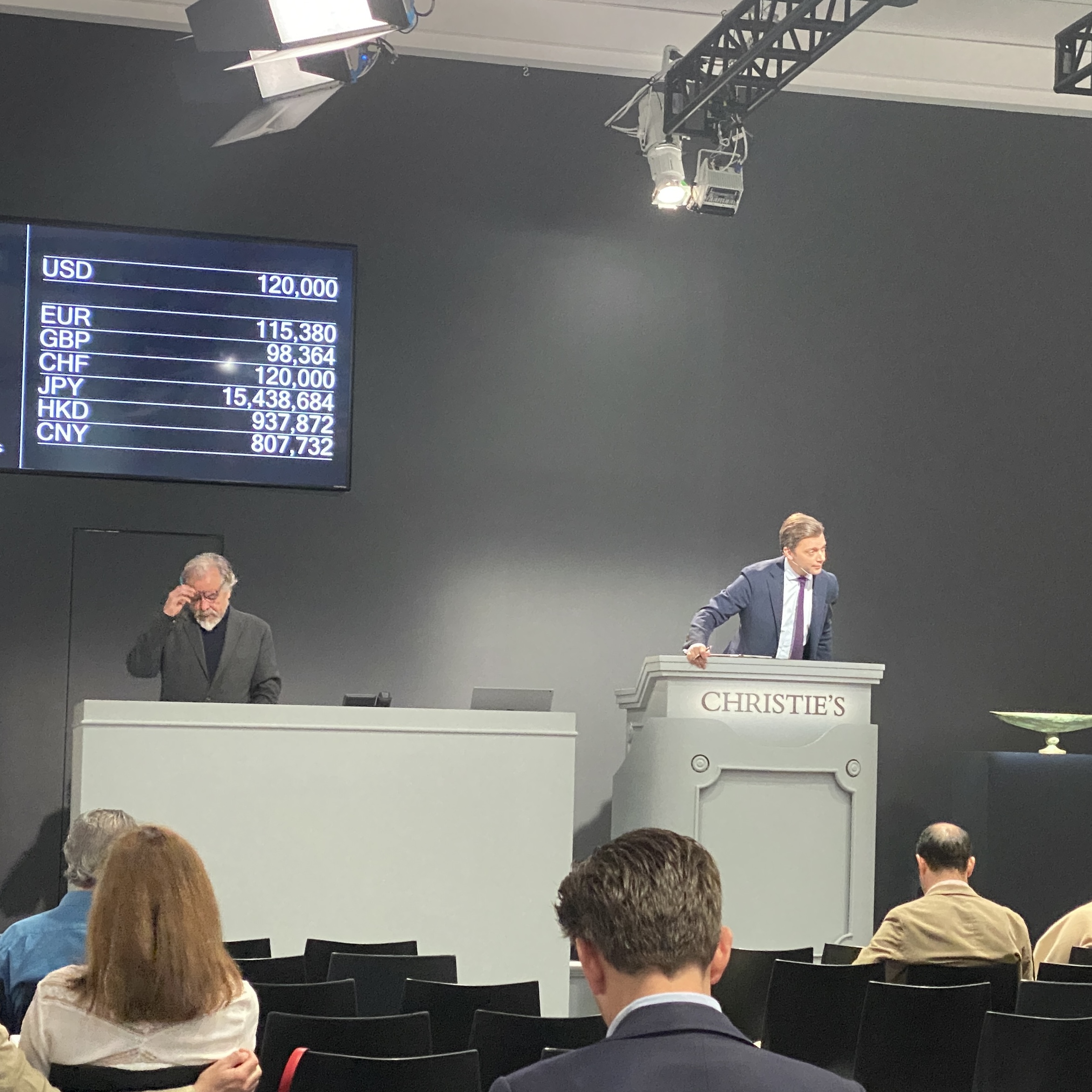 When “our” auction began, we took a seat and soaked up the ambience. It’s all very gracious and dignified. The room is large with select artworks on display on the walls (the “important” pieces). At each side there are two rows of telephone banks staffed by about 30 Christie’s employees, communicating in hushed tones with the very, very wealthy people on the other end of the line. High on the back wall are a bank monitors showing bids being submitted through Christie’s website. And on the podium at the front stands the auctioneer. He is flanked by two monitors showing the item currently being sold, and a third over his right shoulder showing the current bid, in multiple currencies.. He looks to be a very pleasant young man who is throughly enjoying being the centre of all the action. (Later he would be replaced by an equally pleasant woman, with an equally dignified European accent).