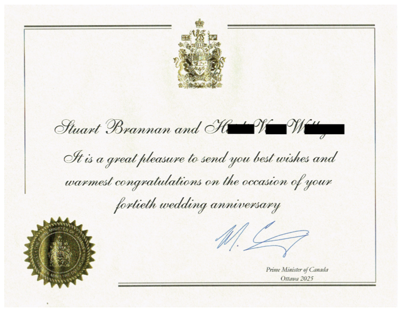You may or may not know that Canada got a new Prime Minister on 14 March of this year. Although Mark Carney had a lot of things on his plate1 after his swearing in ceremony, I like to believe that his very first priority was to sign this certificate2.