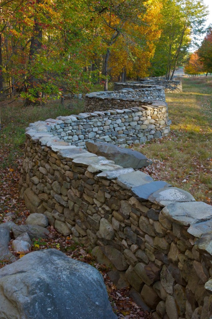 At the Storm King Art Center in New Jersey, British artist Andy Goldsworthy is keeping the tradition alive. He has completed 2 drystone walls as art installations: one in 1998 and another in 2010. In part, the walls were built over previous walls so, when I visited several years ago, it wasn’t immediately obvious whether Goldsworthy’s work were functional walls, or art, or a bit of both. But in other sections, they definitely curve more than most.